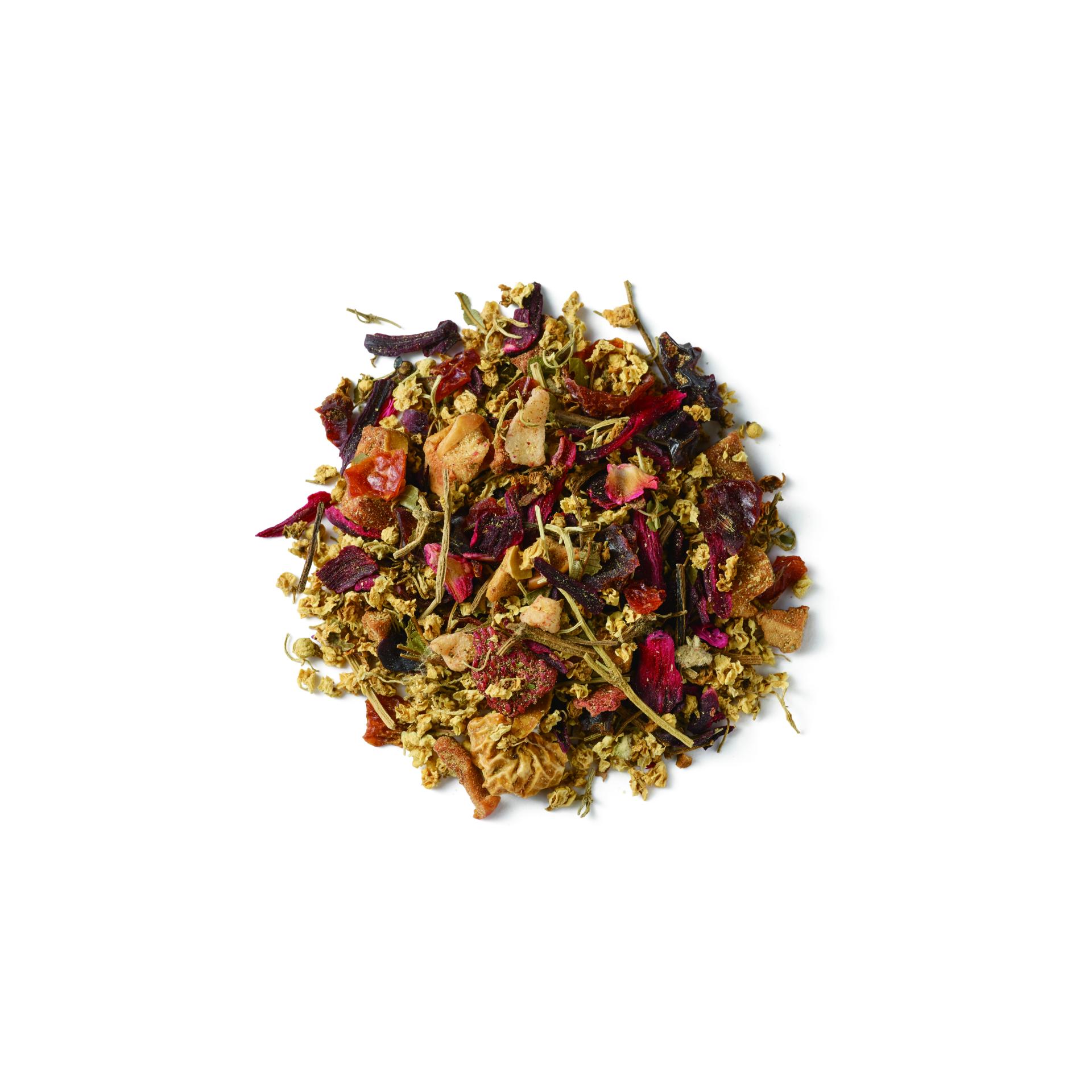 엘더베리꽃, 사과비트, 히비스커스, 로즈힙열매껍질, 포도, 블랙베리잎, 딸기비트, 천연 딸기향, 수레국화꽃잎