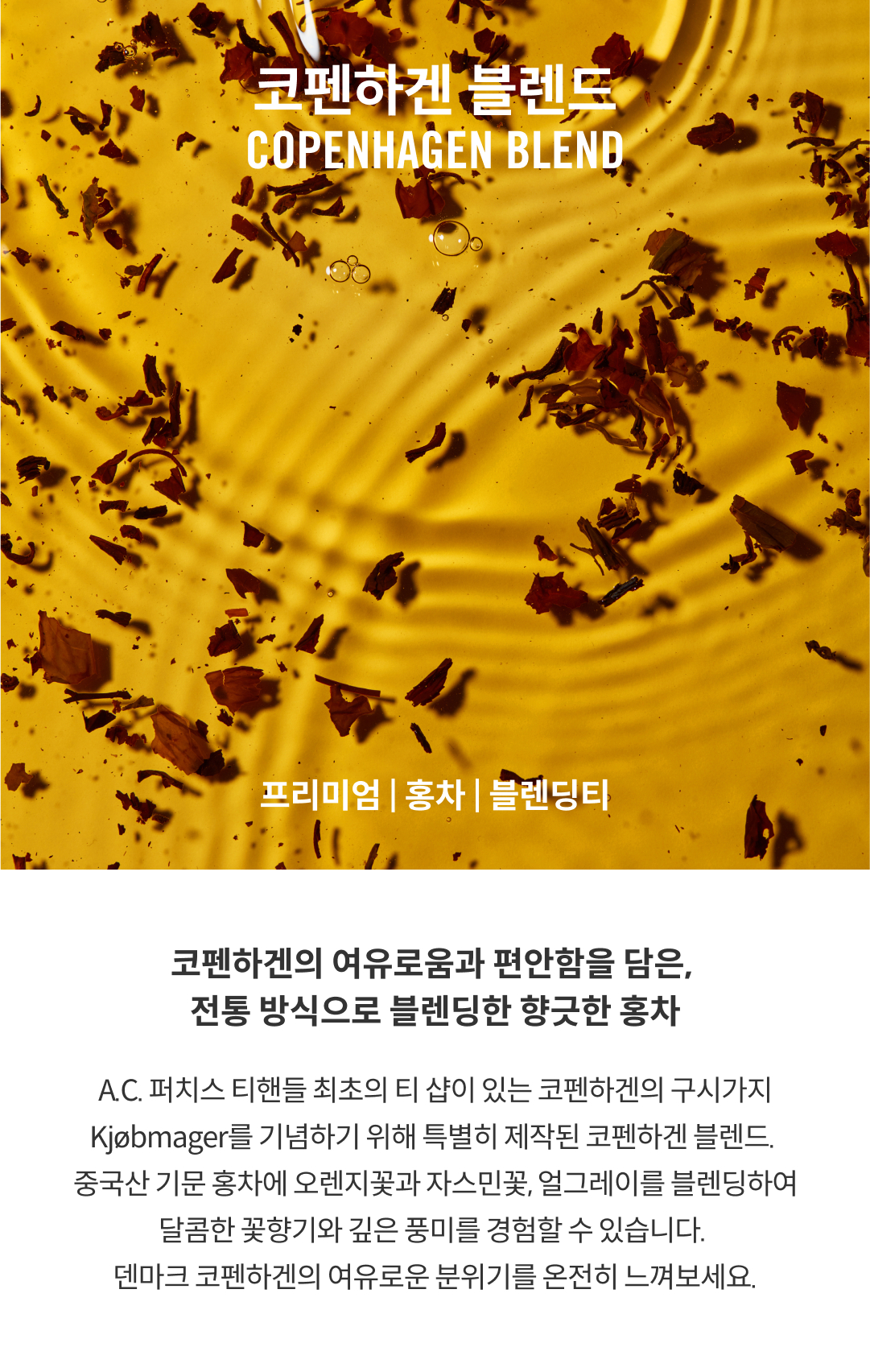 코펜하겐의 여유로운 분위기를 담은 A.C. 퍼치스 티핸들의 아이코닉티로, 얼그레이와 기문 블렌드, 오렌지, 자스민꽃의 향긋함이 매력적인 티